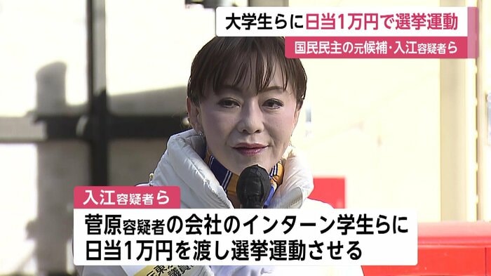 その後の捜査関係者への取材で、入江容疑者らが菅原容疑者の会社にインターンで来た大学生らに日当1万円を渡して選挙運動させていたことが分かった。