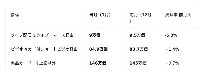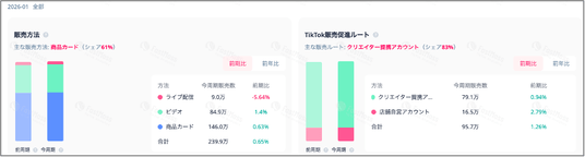 ライブ配信・カゴ付きショート動画・商品カードの販売推移を見ると、1月はライブ経由が前月比▲5.3%と減少した一方、ビデオ経由は+1.4%、商品カード経由は+0.7%と堅調に推移しました。特にライブ販売の減少は、年末セール反動や実施本数減少の影響が考えられます。一方で、ショート動画および商品カード経由の販売が底堅く、流入構造がより安定型へシフトしている状況が確認されます。また、アカウント別では、クリエイター連携アカウント(+1.3%)および店舗自営アカウント(+1.2%)ともに微増となり、販売チャネルの分散と自社運用強化が継続しています。