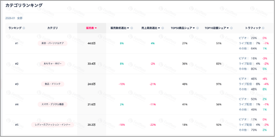 「スマホ・デジタル機器」は+1.9%と横ばい圏で推移しており、全体としては、嗜好性よりも実用性・日常消費型カテゴリーが選好される構造が鮮明となっています。また、上位カテゴリーでは引き続き動画経由の流入比率が高く、ショート動画主導型の販売構造が定着しつつある状況が確認されます。