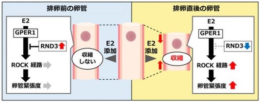 - 平滑筋緊張度制御に関与する因子であるRhoキナーゼおよびRND3の活性の違いにより、排卵前後で E2に対する反応性が異なりました。