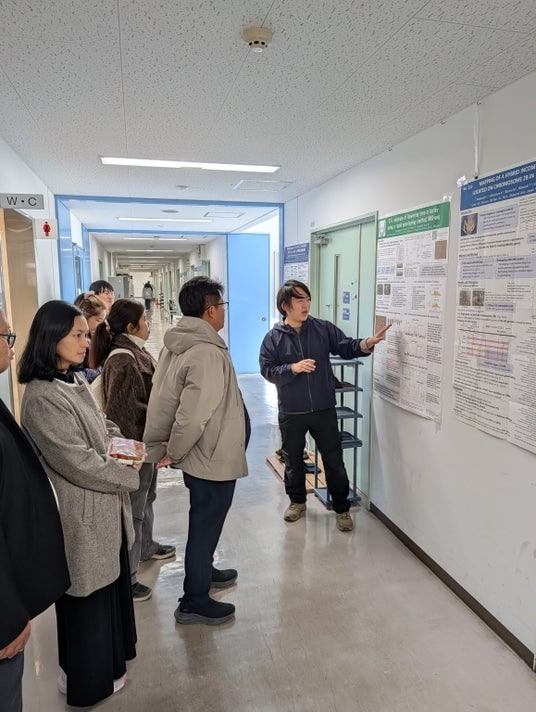 一行は農学部の研究室を見学し、研究内容や今後の交流について意見交換を行いました。その後、岡山大学農学部長 一瀬勇規教授、岡山大学学術研究院環境生命自然科学学域(農)の中嶋佳貴准教授と本学の大学院生1名、学部生2名を交えて昼食交流会を実施し、和やかな雰囲気の中で学生生活や研究紹介を通じた交流が深まりました。