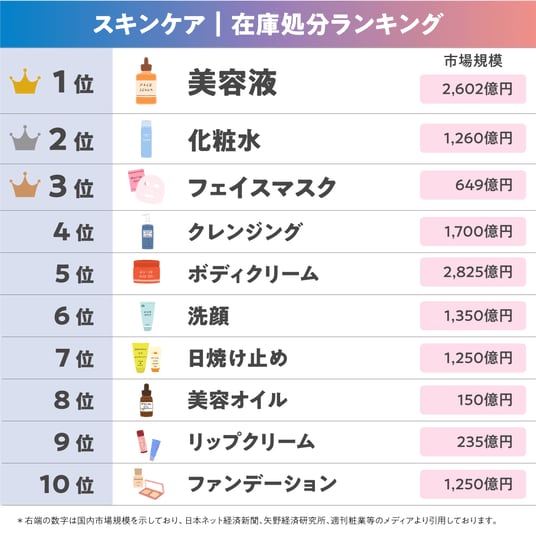 株式会社ビューズは、化粧品メーカー様から日々寄せられた624商品の在庫処分に関するご相談をもとに、「総合」とヘアケアを省いた「スキンケア」部門の二つに分けて「化粧品在庫処分相談ランキングTOP10」を集計・発表いたしました。今後の化粧品企画の注意点として活用いただければと思います。