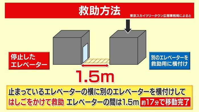 東京スカイツリーの広報事務局によると、停止したエレベーターの横に別のエレベーターを横付けし、その間にはしごをかけて救助したといいますが、エレベーター間の移動は17分ほどで終わったといいます。