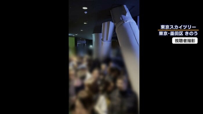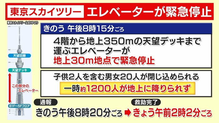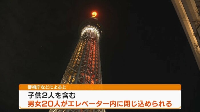 22日、午後8時15分頃、東京・墨田区にある「東京スカイツリー」のエレベーターが地上30m地点で緊急停止し、子ども2人を含む男女20人がエレベーター内に閉じ込められました。