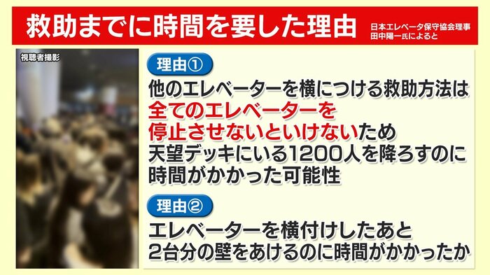 ・今回取られた救助方法は、全てのエレベーターを停止させないといけないため、天望デッキに残された約1200人を降ろすのに時間がかかった可能性。