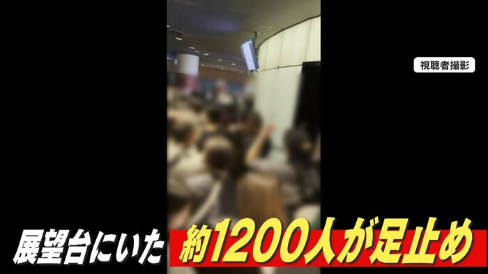地上340mの展望台で撮影された映像には、身動きが取れず困惑した人々の姿が。何が起こっているのか把握し切れていないのか、周囲を何度も見回す人もいます。