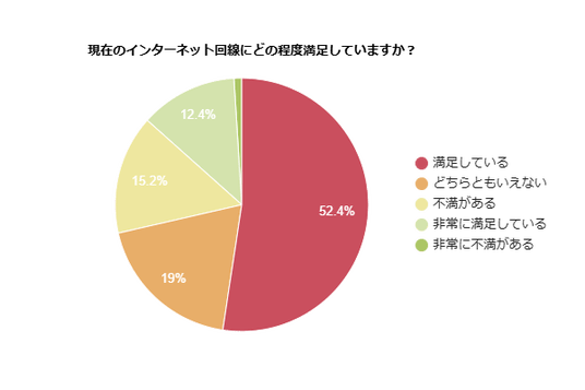 現在のインターネット環境に対して、「満足している」(52.4%)、「非常に満足している」(12.4%)と回答した方はあわせて64.8%でした。一方で、「不満がある」(15.2%)、「非常に不満がある」(1%)は計16.2%存在し、「どちらともいえない」(19%)も一定数みられました。