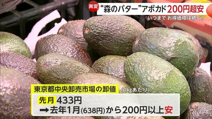 アボカドは主な産地であるメキシコで、記録的な豊作となっている。東京都中央卸売市場の1月の卸値は1kgあたり433円で、前年の1月と比べると200円以上も安くなっている。