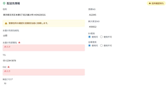 営業部門から連携される伝票に、住所の階数やエレベーターの有無といった必須情報の記入漏れが散見されます。さらに、伝票データの連携が配送日のわずか「2日前」と遅いため、システム上で修正を行う時間的猶予がなく、現場担当者が電話で再確認し、手書きで補足する作業が発生していました。