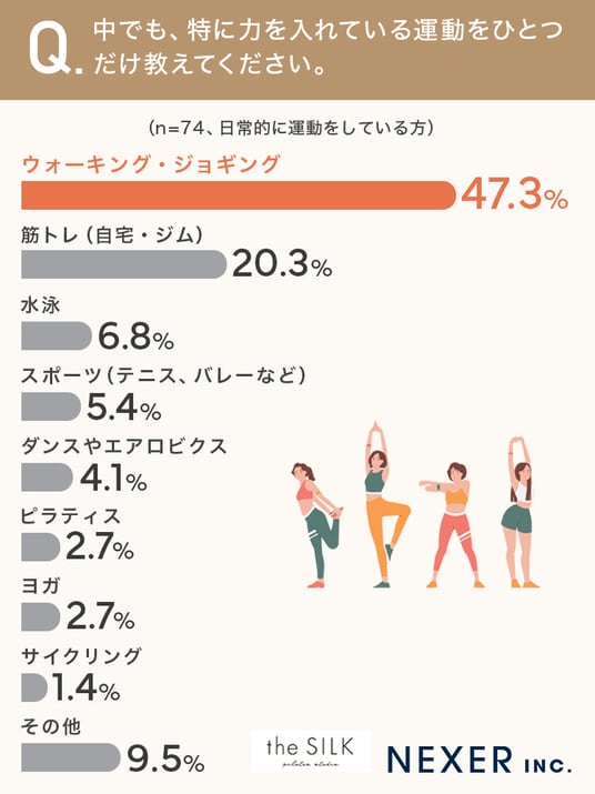 その結果「ウォーキング・ジョギング」が47.3%でトップとなり、次いで「筋トレ(自宅・ジム)」が20.3%、「水泳」が6.8%、「ピラティス」が2.7%という結果でした。