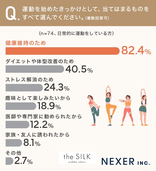 その結果、最も多かったのは「健康維持のため」の82.4%、次いで「ダイエットや体型改善のため」が40.5%、「ストレス解消のため」が24.3%でした。