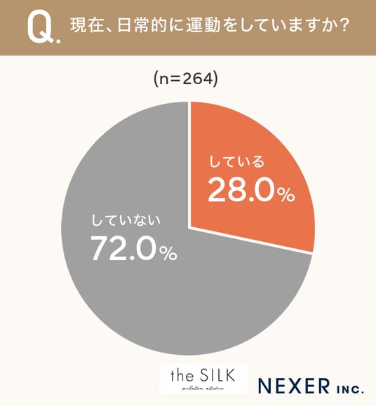 その結果「運動をしている」と回答したのは28.0%にとどまり、「運動をしていない」と答えた人は72.0%でした。