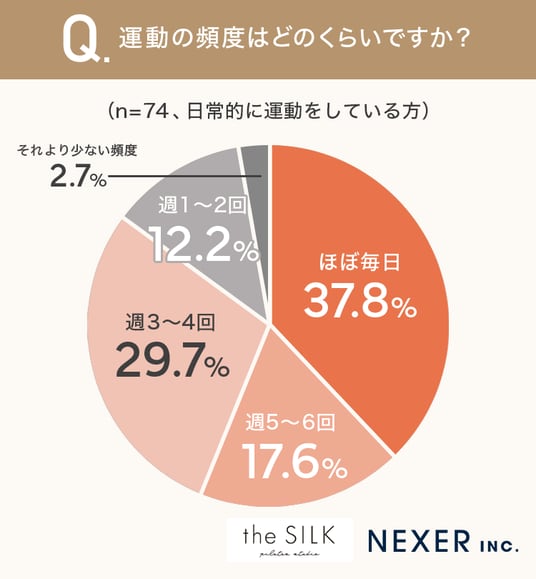 その結果「ほぼ毎日」が37.8%、「週3~4回」が29.7%、「週5~6回」が17.6%となり、週の半分以上運動している人が多いことがわかりました。