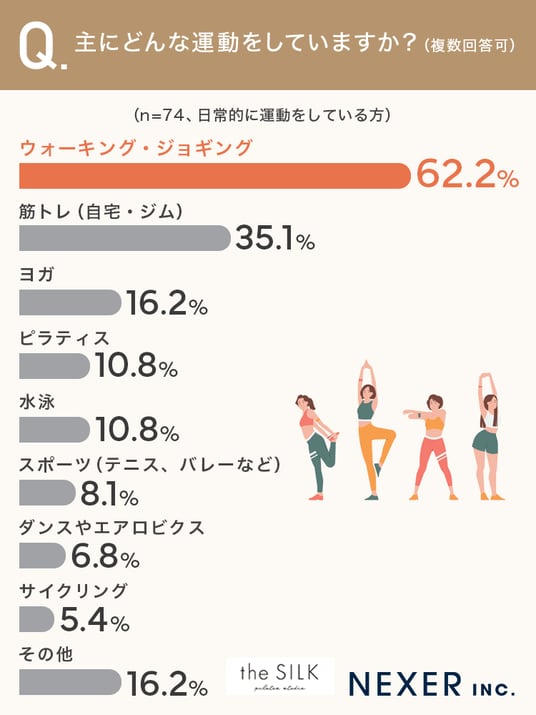 その結果「ウォーキング・ジョギング」が62.2%と最も多く、次いで「筋トレ(自宅・ジム)」が35.1%、「ヨガ」が16.2%でした。