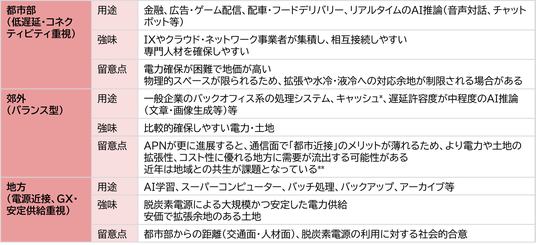 - 今後のデータセンターは、用途や機能に応じて、都市・郊外・地方に分散すると考えられる