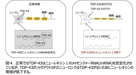 ニューロンにおいて、TDP-43がノックアウトされた状態で発現量が変化する分子を探索すると、ニューレキシン1が減少していることがわかりました。また、TDP-43はニューレキシン1のメッセンジャーRNAを安定化することでニューレキシン1の発現量を調節していました(図4)。