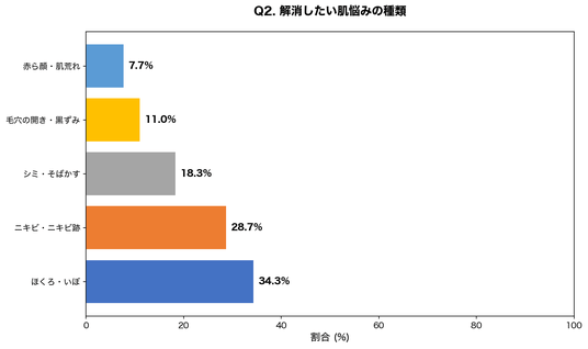 ・最も解消したい肌悩みは「ほくろ・いぼ」が34.3%でトップ、次いで「ニキビ・ニキビ跡」28.7%