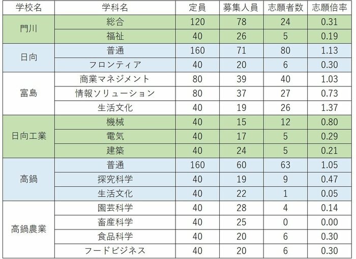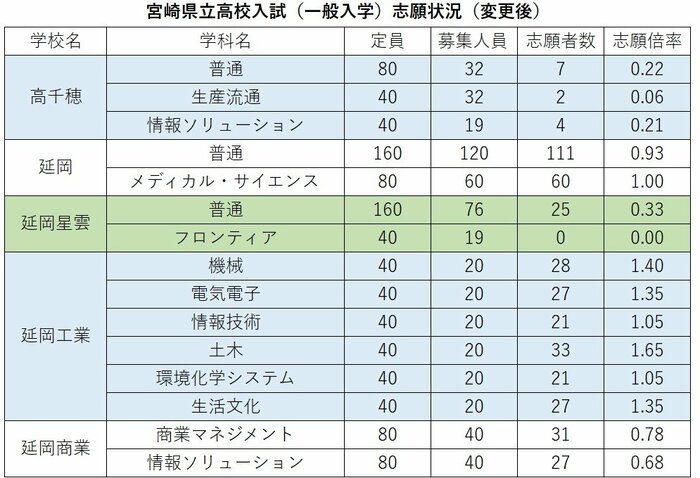 延岡は普通科が0.93倍、メディカル・サイエンス科が1.00倍。延岡工業は機械科が1.40倍、電気電子科が1.35倍、土木科が1.65倍、生活文化科が1.35倍と高倍率になった。