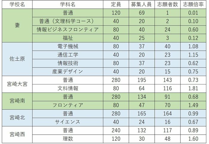 佐土原は電子機械が1.08倍、通信工学が1.15倍。宮崎大宮は普通科が0.73倍、文科情報科が1.81倍。宮崎南は普通科が0.68倍、フロンティア科が1.49倍。宮崎北は普通科が0.99倍、サイエンス科が0.67倍。宮崎西は普通科が0.89倍、理数科が1.60倍となっている。