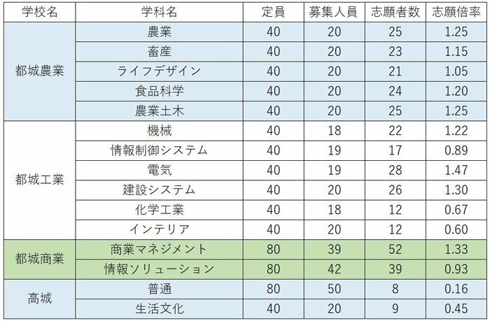 都城農業は農業科が1.25倍、畜産科が1.15倍、食品科学科が1.20倍、農業土木科が1.25倍。都城工業は機械科が1.22倍、電気科が1.47倍、建設システム科が1.30倍。都城商業の商業マネジメント科は1.33倍と高くなっている。