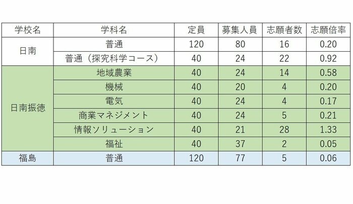 延岡青朋の普通科が0.49倍、宮崎東の普通科(昼間の部)が0.84倍などとなっている。