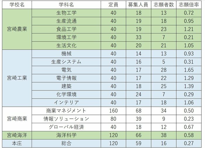 宮崎農業は食品工学科が1.21倍。生活文化科が1.05倍。宮崎工業は電気科が1.65倍、電子情報科が1.29倍、建築科が1.39倍と、いずれも高い倍率。