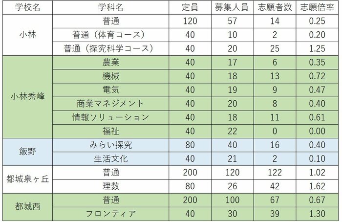 小林は普通科(探究科学コース)が1.25倍。都城泉ヶ丘は普通科が1.02倍、理数科が1.62倍。都城西は普通科が0.67倍、フロンティア科が1.30倍。