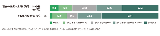 ・一般社員では、上司への満足度が高いほど「管理職になりたい」と回答する割合が高く、満足度が低い層ほど「なりたくない」とする割合が高かった。