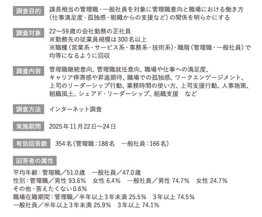 これらが実現されている状態を、管理職という役職に対する持続可能性が高い状態と捉え、その実現に寄与する職場・組織の要因を明らかにすることを目的に調査を行いました。