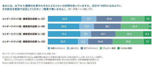 ・一方、エンゲージメント高・継続意向高群では、「プレイヤー業務」の割合が相対的に低く(21.5%)、「方針づくり」や「部下マネジメント」といった管理職本来の役割に時間を配分できている。