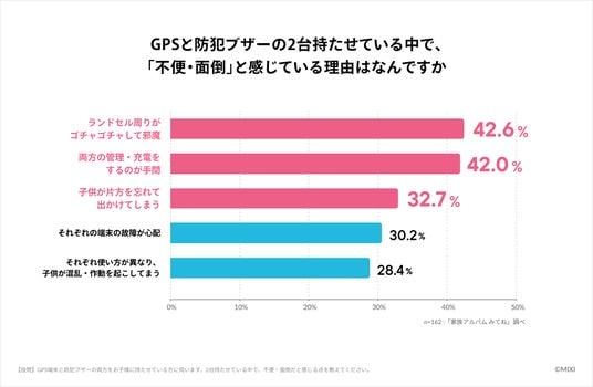 主な理由としては、「ランドセル周りがゴチャゴチャする/子供が嫌がる」(42.6%)、「両方の管理・充電が手間」(42.0%)、「子供が片方を忘れて出かけてしまう」(32.7%)が挙げられました
