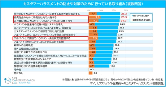 また、効果を感じた取り組みでは「再発防止のために事例を社内で共有する」が9.6%で最も高く、「正社員に対し、カスタマーハラスメント対応の研修を行う(7.9%)」が続いた。