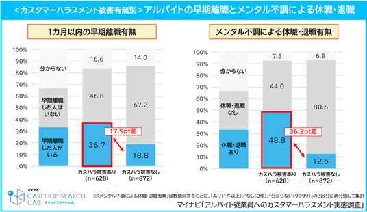 さらに、「メンタル不調による休職・退職があった」割合についても、カスタマーハラスメント被害があった企業では48.8%と、被害がなかった企業を36.2pt上回っている。