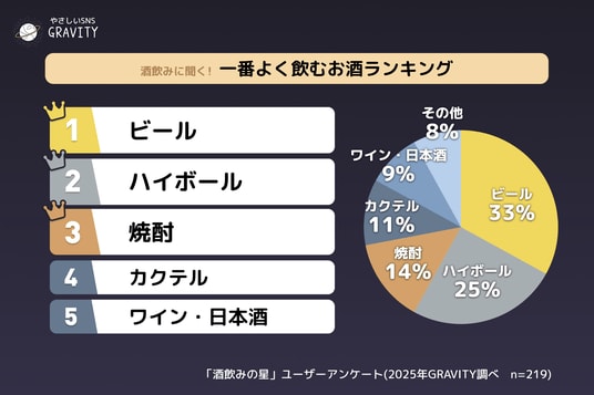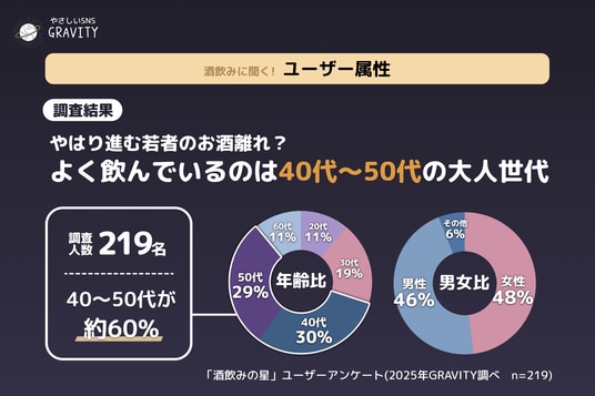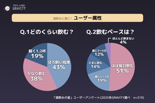 第二回目は、「酒飲みの星」現在109,534名が登録しているコミュニティです。推しのお酒・おつまみ紹介、居酒屋トーク、オススメのおつまみレシピや、ちょっと言いづらい“飲み会あるある”まで、リアルな酒飲みたちの本音が飛び交っています。今回はそんな「酒飲みの星」ユーザー219名にアンケートを実施。普段なかなか語られない「みんなのお酒事情」や「飲み会のリアル」「正直しんどい瞬間」などが明らかになりました。