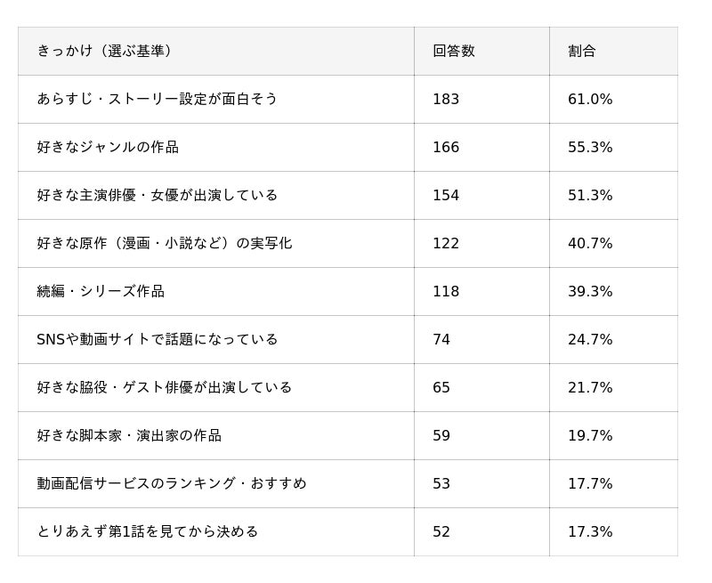 新しいドラマを視聴するきっかけとしては、「あらすじ・ストーリー設定が面白そう」が61.0%で1位となり、「好きなジャンルの作品」(55.3%)、「好きな主演俳優・女優が出演している」(51.3%)が続きました。