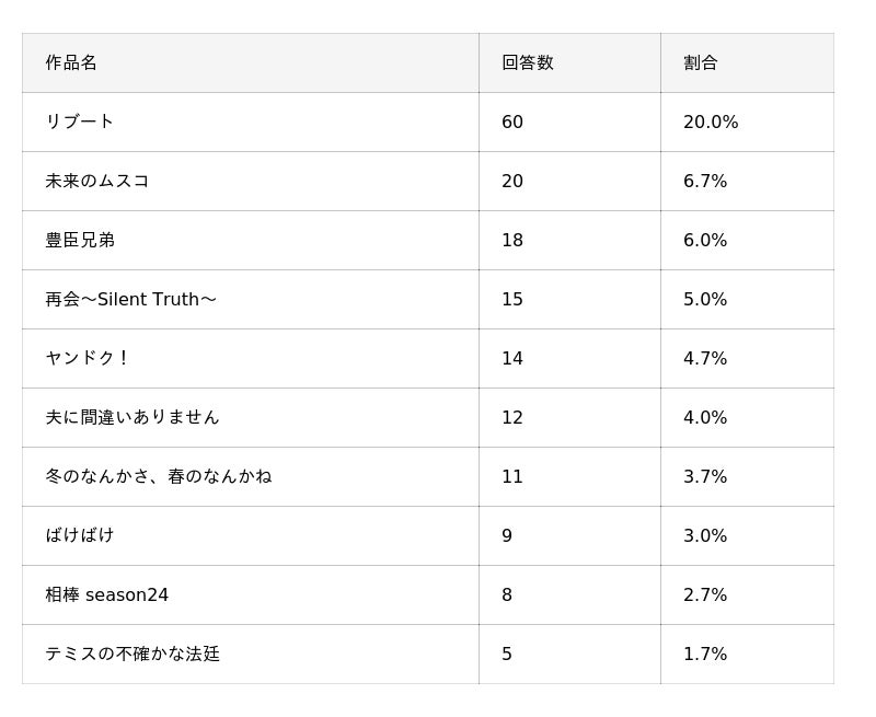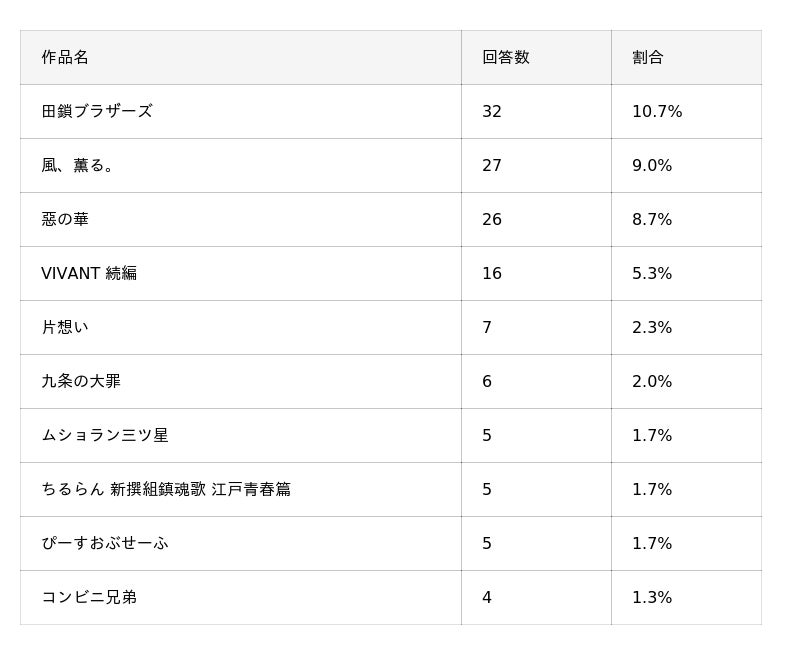 次シーズンに放送・配信予定の作品で視聴を予定しているものとしては、「田鎖ブラザーズ」が10.7%(32人)で1位、「風、薫る。」が9.0%(27人)で2位、「惡の華」が8.7%(26人)で3位となり、上位3作品が拮抗する結果となりました。
