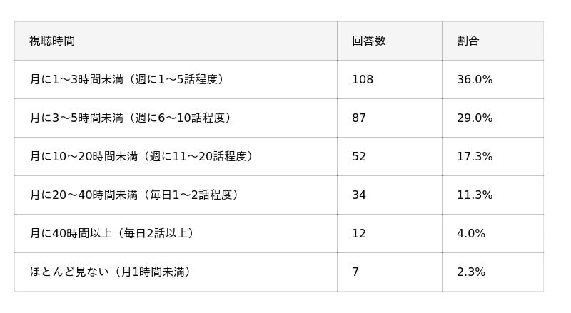 月間の視聴時間については、「月に1~3時間未満(週に1~5話程度)」が36.0%で最多、「月に3~5時間未満(週に6~10話程度)」が29.0%と続き、月1~5時間未満のライトユーザーが全体の65.0%を占めました。