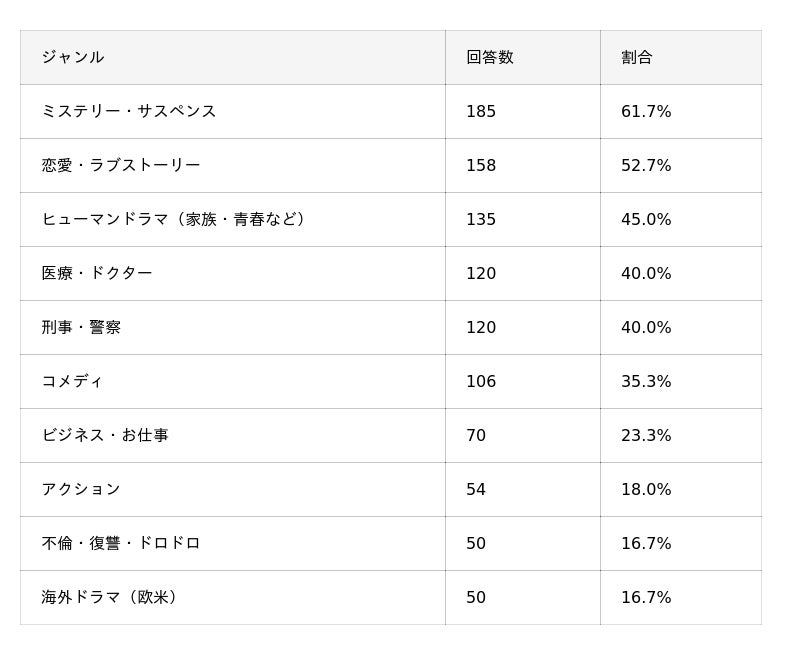 好きなドラマのジャンルでは、「ミステリー・サスペンス」が61.7%(185人)で最多となり、「恋愛・ラブストーリー」が52.7%(158人)で続きました。