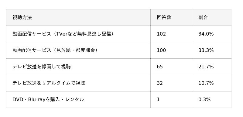 特にドラマではTVerなどの無料見逃し配信の利用率が高く、テレビ放送との連携が強い視聴環境が特徴的です。