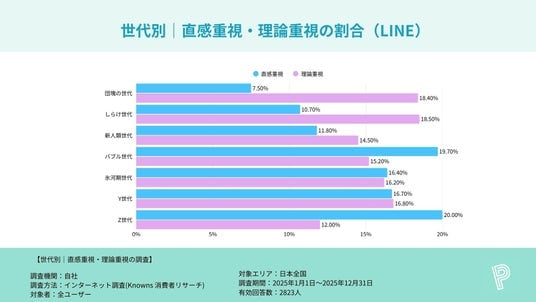 SNS別に世代傾向を整理すると、Threadsは全体でも直感重視17.2%・理論重視15.5%と極端な偏りが小さく、世代によって“直感・理論のバランスが変化しやすい媒体”といえます。LINEは全体では直感重視16.0%・理論重視15.5%と拮抗しつつ、バブル世代のみ直感重視19.7%と伸びが見られました。Xは全体で直感重視が16.9%と高い一方、しらけ世代では理論重視22.1%が突出するなど、同じSNSでも世代ごとに“使い方・意思決定スタイル”が異なることが示されています。