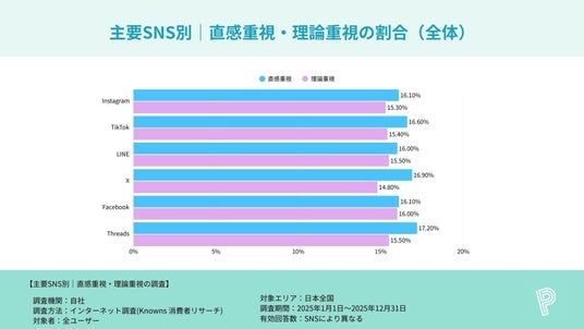 1.【全体傾向】主要SNSでは「直感派・理論派」が拮抗、全体は15~17%台で横並び