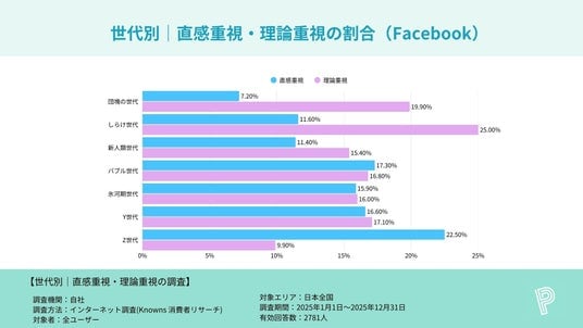 調査内容:各SNS利用者に対し「直感重視」「理論重視」の傾向について世代別に集計・比較