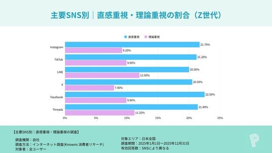 ・Z世代は全SNSで“直感重視”が20%超となり、特にFacebook(22.5%)・Instagram(21.7%)・Threads(21.4%)で高い傾向