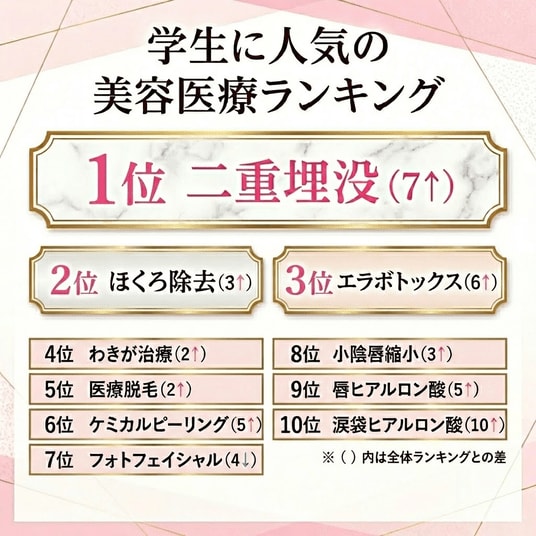1位に選ばれたのは二重埋没。全年齢ランキングから7位アップと学生世代で圧倒的人気。初めての美容医療として選ばれやすく、アイプチ卒業や垢抜け目的が中心です。
