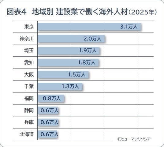 地域別にみると、建設業における海外人材は、東京圏以外でも、地方を含む各地域で幅広く就業しています。地域インフラや公共事業、住宅など、各地で発生する需要への対応が必要であることから、海外人材が全国の現場を支える存在となっています。