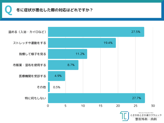 TOP3 1.温める(入浴・カイロなど):27.5% 2.ストレッチや運動をする:19.4% 3.我慢して様子を見る:11.2%