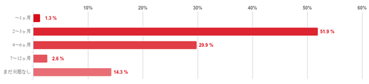 「2~3ヶ月」と回答した人が51.9%で過半数となり最も多く、次に「4~6ヶ月」との回答が29.9%で約3割を占めた。また、「まだ実感なし」と回答した人が14.3%と少数みられ、「~1ヶ月」や「7~12ヶ月」との回答は僅かとなった。