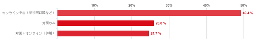「オンライン中心(※初回以降など)」と回答した人が49.4%で最も多く、回答者の約5割がオンライン中心で診察を受けていることがわかった。また、「対面のみ」と回答した人が26.0%、「対面+オンライン(併用)」との回答が24.7%だった。