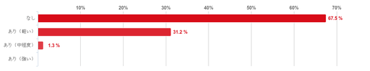 「なし」と回答した人が67.5%と回答者の7割近くを占め最も多く、「あり」との回答を大きく上回り、治療による副作用はない人が多いことがわかった。また、「あり」との回答の中でも「あり(軽い)」と回答した人が31.2%で、「あり(中程度)」と回答した人は1.3%と僅かだった。