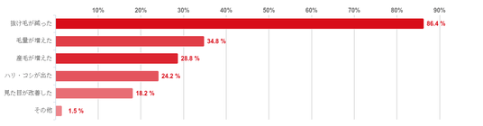 「抜け毛が減った」との回答が共に86.4%で圧倒的に多く、次いで「毛量が増えた」(34.8%)、「産毛が増えた」(28.8%)と続いた。そのほか、「ハリ・コシが出た」、「見た目が改善した」などの回答も一定数みられた。